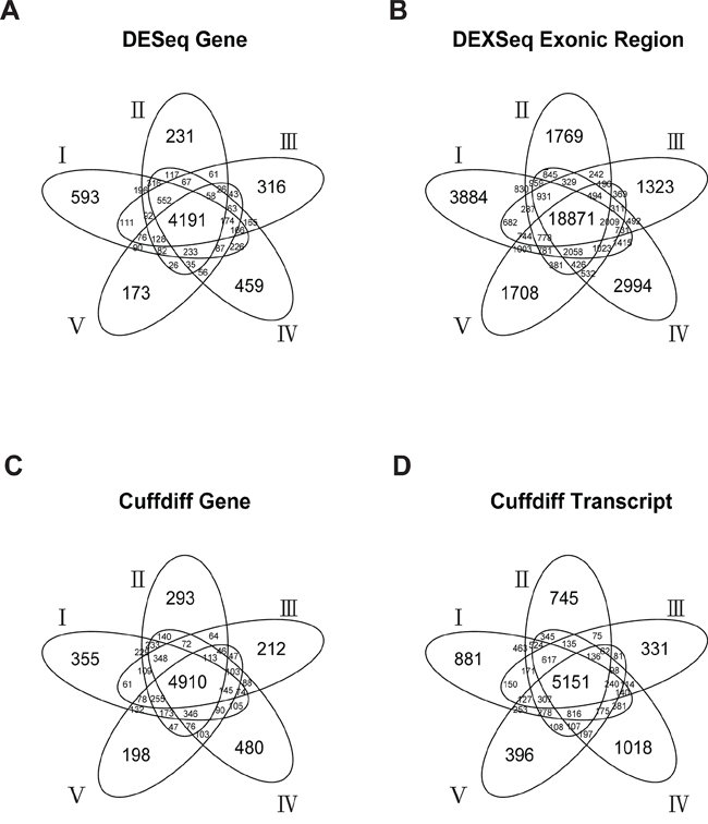 Figure 2: Numbers of DESeq-identified DEGs A. DEXseq-identified DEEs B. Cuffdiff-identified DEGs C. and Cuffdiff-identified DETs D. in the five-replicate experiments (I–V).