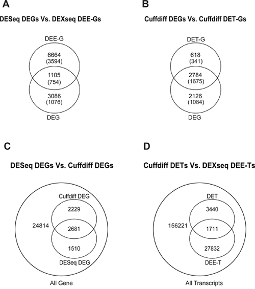 Figure 3: Intersection between DESeq-identified DEGs and DEXseq-identified DEE-Gs A. between Cuffdiff-identified DEGs and DET-Gs B. between DESeq-identified and Cuffdiff-identified DEGs C. and between Cuffdiff-identified DETs and DEXseq-identified DEE-Ts D. Numbers in parentheses in (A) and (B) indicate the numbers of genes that are associated with cancer genes/characteristics according to MGSA.