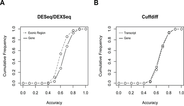 Figure 4: Cumulative frequencies of tumor vs. normal classification accuracy based on A. individual DESeq-identified DEGs or DEXseq-identified DEEs, and B. Cuffdiff-identified DEGs or DEGs. This figure only shows the results derived from replicate I in the five-replicate experiments. Results of replicates II–V are given in Supplementary Figure S1.