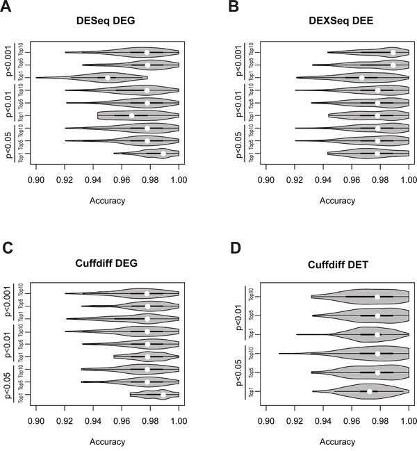 Figure 5: Violin-plot accuracy distribution of tumor vs. normal classification in 100-replicate experiments according to A. DEG-identified DEGs, B. DEXseq-identified DEEs, C. Cuffdiff-identified DEGs, and D. Cuffdiff-identified DETs. White dots denote median classification accuracies.