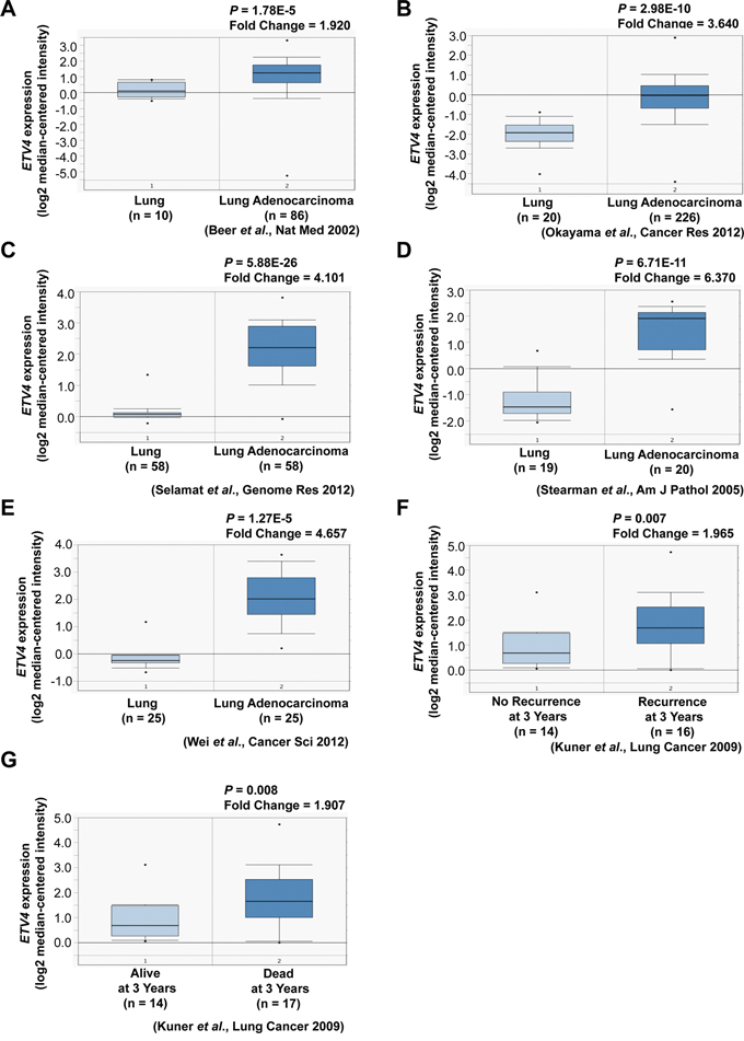 Full-length human ETV4 (NM_001986) was amplified from the cDNA of CL1-5 cells by polymerase chain reaction (PCR), using forward primer (F) gggaattcGG ATGGAGCGGA GGATGAA and reverse primer (R) gggcggccGC TGGGGGCTAG TAAGAGT, where gggaattc and gggcggcc were sequences including the restriction enzyme cutting site. The gene was cloned into the EcoRI and NotI sites of pcDNA6 (Invitrogen). ETV4 shRNA clones (TRCN0000013933 and TRCN0000013936) and the luciferase shRNA control clone (TRCN0000072244) were purchased from the National RNAi Core Facility at Academia Sinica, Taipei, Taiwan. All plasmids were confirmed by DNA sequencing.