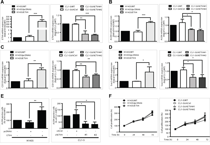 Total RNA was isolated by using Trizol (Invitrogen) and used as a template for reverse transcription into cDNA by using the M-MLV Reverse Transcription Kit (Invitrogen). To quantify mRNA expression, qRT-PCR was performed with a LightCycler 480 (Roche) for the following genes (primer pairs): ETV4 (F: gcagtttgtt cctgatttcc a, R: actctggggc tccttcttg), ALDH (F: ccaaagacat tgataaagcc ataa, R: cacgccatag caattcacc), CD133 (F: ggaaactaag aagtatggga gaaca, R: cgatgccact ttctcactga t), SOX2 (F: atgggttcggtggtcaagt and reverse primer: actctggggctccttcttg), and GAPDH (F: agccacatcg ctcagacac, R: gcccaatacg accaaatcc). Relative gene expression was calculated by 2−ΔCT (ΔCT = CT of target gene – CT of GAPDH gene; CT is the cycle threshold).