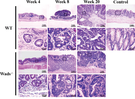 Figure 1: Establishment of CRMAC murine model in WT and Wads−/− mice. Mice were sacrificed 4, 8 and 20 weeks after AOM injection, respectively. Sections obtained from model mice and normal control mice were stained with HE for histopathological assessment. At week 4, both WT and Wads−/− mice showed dysplasia of colonic glands. Adenomas were observed at week 8. At week 20, typical adenocarcinoma appeared both in WT mice and Wads−/− mice. Views in the frames of upper panel are zoomed in in lower panel.
