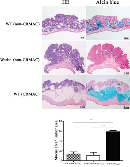 Figure 2: At week 37, adenocarcinomas developed CRMAC in half of WT mice, identified by HE and Alcian blue staining to assess the percentage of the mucus area (≥50% of the total tumor area). The rest WT and all Wads−/− mice displayed no or few mucus that were defined as non-CRMAC (***P < 0.001).