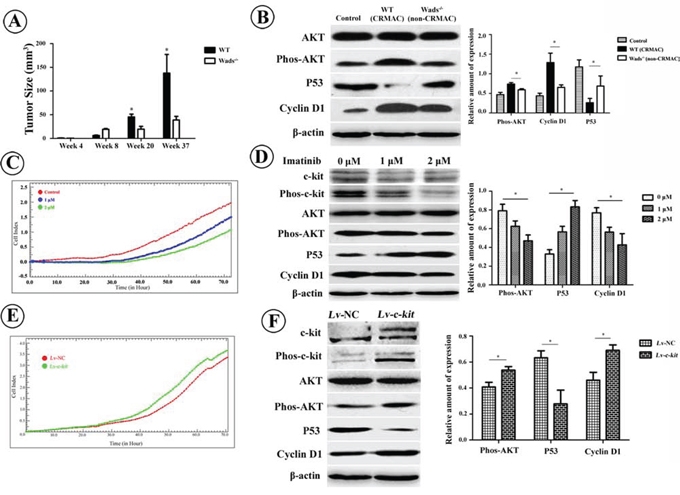 Figure 4: A. Compared with Wads−/− mice, tumors grew much faster in WT mice starting from 20 weeks after AOM injection (*P < 0.05, **P < 0.01). B. At week 37, compared with non-CRMAC in Wads−/− mice, AKT phosphorylation and cyclin D1 expression were highly increased whereas p53 expression was significantly decreased in CRMAC of WT mice (*P < 0.05). C. Imatinib treatment caused a dose-dependent proliferative suppression of HCT-116 cells recorded by RTCA. D. Imatinib treatment for 36 hrs attenuated activation of c-kit and AKT. Under the same condition, p53 was increased whereas cyclin D1 was decreased in a dose-dependent manner (*P < 0.05). E. Overexpression of c-kit in HCT-116 cells significantly promoted cellular proliferation in the presence of exogenous rhSCF (10 ng/ml). F. Hyperexpressed c-kit resulted in AKT activation which also reduced p53 and enhanced cyclin D1.