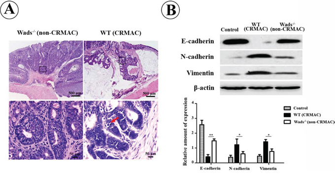 Figure 5: CRMAC in WT mice showed more invasiveness than non-CRMAC in Wads−/− mice did at week 37. A. Tumor cells and mucinous extended beyond the basement membrane of mucosa and invaded into submucosa in WT mice, in which tumors developed more atypical glands and displayed more pathologic mitoses (red arrow). Views in the frames of upper panel are zoomed in in lower panel. B. EMT was strikingly elevated in CRMAC compared with non-CRMAC indicated by decreased E-cadherin and increased N-cadherin and vimentin. (*P < 0.05,**P < 0.01).