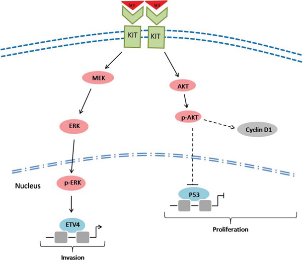 Figure 7: A scheme showing the potential role of c-kit signaling in the development of CRMAC. SCF triggered c-kit signaling might increase cyclin D1 and decrease p53 through activating AKT pathway, thus enhance tumor cell proliferation. Furthermore, stimulated c-kit could increase ETV4 through activating MEK/ERK pathway, consequently confer a stronger capacity of tumor invasion.