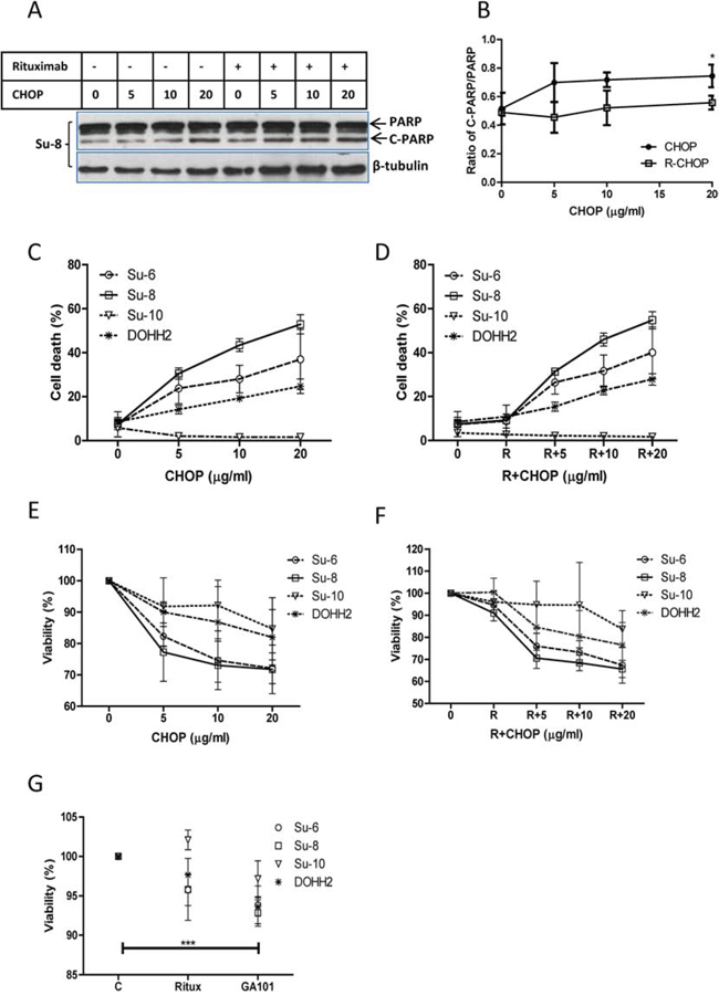 Firstly, we compared the killing efficacies of R-CHOP and CHOP on malignant B-cells in vitro. Four DLBCL cell lines, Su-6, Su-8, Su-10, and DoHH2, were treated with 3 different doses of CHOP and/or 10 μg/ml of rituximab for 24 hours. Treatment with 20 μg/ml of CHOP induced a significantly increased PARP cleavage, a marker for apoptosis. However, there was no significant difference in the amount of PARP cleavage between CHOP and R-CHOP-treated cells (Figure 1A and 1B, Supplemental Figure 1A). The four cell lines showed differential sensitivities to CHOP or R-CHOP-induced cell death and cytotoxicity (Figure 1C–1F), but again there was no statistical difference between the treatment with CHOP and R-CHOP, as analyzed by ANOVA (P > 0.05). GA-101, another anti-CD20 antibody, significantly induced cytotoxicity on DLBCL cells but rituximab failed to do so (Figure 1G). These results demonstrate that rituximab may not kill DLBCL cells directly.