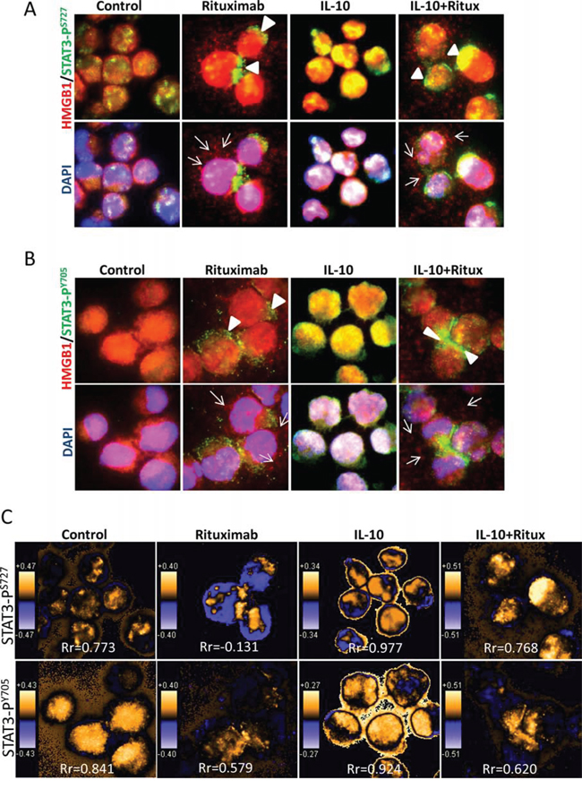 Figure 3: Rituximab induced intracellular shuttling of STAT3 and HMGB1. DoHH2 cells were treated with rituximab for 4 hours. Cells were co-stained with a mouse anti-HMGB1 (red) and a rabbit anti-STAT3-PS727 A. or STAT3-PY705 B. antibodies (green). The arrow head shows the active STAT3 shuttled to the cytoplasm and the arrow indicates HMGB1 release from the cell. The single color images were shown in the Supplemental Figure 3. C. Colocalization analysis. PDM images and correlation coefficient (Rr) were generated by the intensive correlation analysis using WCIF ImageJ software. The orange color and higher Rr indicate a colocalization and the blue color and a lower or negative Rr means a segregation.