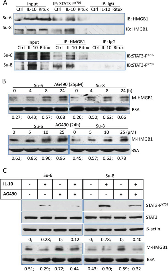 Figure 5: Association between STAT3 and HMGB1. A. Protein binding between HMGB1 and STAT3-PY705. Su-6 and Su-8 cell lines were treated with either IL-10 or HMGB1 for 4 hours. Proteins from cell extracts were precipitated with either a rabbit anti-STAT3-PY705 or a rabbit anti-HMGB1 antibodies. Rabbit IgG was used as a negative control. After Co-IP, blots were probed with a mouse anti-HMGB1 or a mouse anti-STAT3-PY705 antibodies, respectively. B. AG490-induced time- and dose-dependent HMGB1 release. Cells were either treated with 25 μM AG490 up to 24 hours or with different doses of AG490 for 24 hours. HMGB1 in the conditioned medium was determined by Western blotting. Numbers under each blot are ratios of M-HMGB1/BSA. C. Roles of IL-10 and AG490 on STAT3 activity and HMGB1 release. DLBCL cells were treated with IL-10 and or AG490 for 4 hours. Expression of STAT3-PY705 in the cell lysates and HMGB1 levels in the conditioned medium were determined by Western blotting.