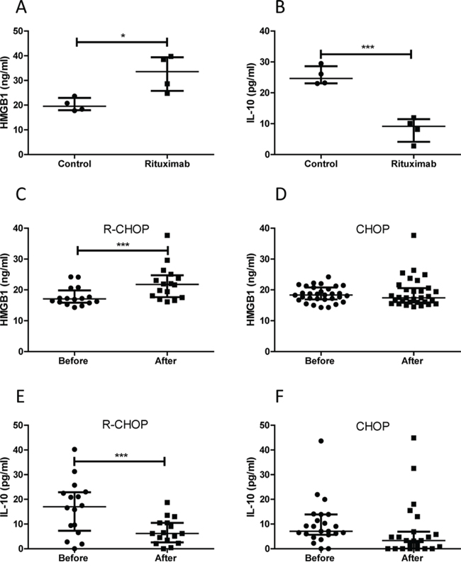 Figure 6: Quantitative analysis of HMGB1 and IL-10 levels. A and B. Rituximab induced HMGB1 release and inhibition on IL-10 production in DLBCL cell lines. Four DLBCL cell lines in 2 × 106/ml concentration were treated with rituximab for 4 hours. 10 μl of conditioned medium was used to measure concentrations of HMGB1 (A) and IL-10 (B) C and D. HMGB1 plasma concentrations before and after treatment with R-CHOP (C) or CHOP (D) E and F. IL-10 plasma concentrations before and after treatment with R-CHOP (E) or CHOP (F) Data shown are median ± interquartile range. Two pairs of extreme data, HMGB1 (from 135.38 to 25.67 ng/ml) and IL-10 (from 432.45 to 458.97 pg/ml) before and after treatment with CHOP were removed from (D) and (F), respectively, for presentation purpose.