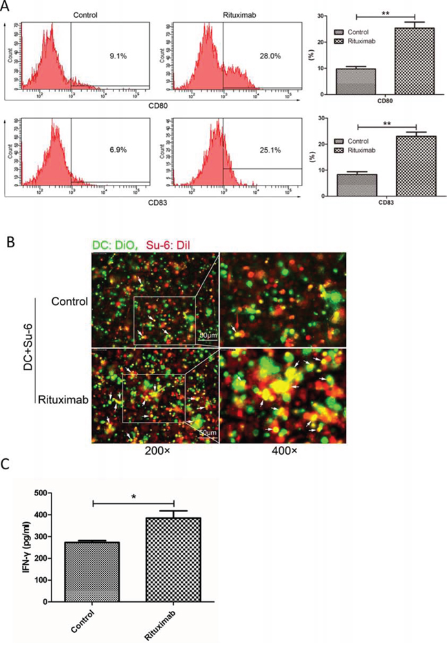 Figure 7: Rituximab induced immune response in both DCs and cytotoxic T-cells. A. DC maturation. DCs were stimulated with conditioned supernatant of control or rituximab-treated cell culture medium. The maturation markers for DCs, CD83 or CD80, were evaluated by flow cytometry and compared between control and rituximab-treated groups. **P < 0.01. Data were expressed as mean ± SD and each value represented the mean of three replicates. B. Fluorescence microscopy analysis of phagocytosis. After 24 hours co-culture of immature DCs with rituximab-treated tumor cells, the engulfment of tumor cells was verified by fluorescence microscopy. DCs were stained with DiO (green) and Su-6 cells were stained with DiI (red). Double positive or yellow cells are fully phagocytized cells. C. IFN-γ production. Immature DCs were pulsed with rituximab-treated DLBCL cells for 24 hours and then co-cultured with autologous CD8+ T lymphocytes. IFN-γ concentration in the supernatant was assessed after 10 days using the IFN-γ ELISA kit.