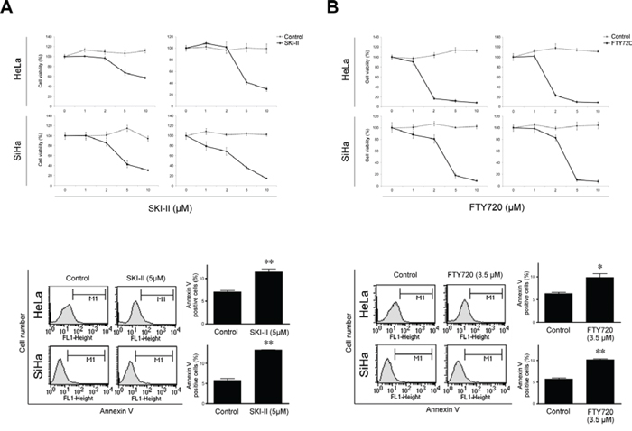 Figure 2: Effects of SPHK inhibitors SKI-II and FTY720 on cell survival and apoptosis in HeLa and SiHa cells. Both A. SKI-II and B. FTY720 elicited cytotoxic effects (upper; MTT assay) and increased apoptosis (lower; FACS analysis). FTY720 exerted more potent inhibitory effects than SKI-II in both cell lines. The error bar represents standard error of mean. *p < 0.05, **p < 0.01.