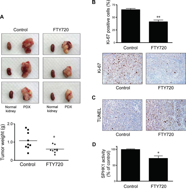 Figure 4: Effects of FTY720 on in vivo tumor weight, cell proliferation, apoptosis, and enzymatic activity of SPHK1 in cervical cancer PDX models. A. In each image, normal kidney (left) and a developed xenograft tissue are shown. FTY720 resulted in a significantly reduced tumor weight compared with PBS-injected control. B. In the FTY720-treated group, harvested tumor tissues showed significantly decreased Ki-67 proliferative indices. C. A significant increase in the number of apoptotic cells in the FTY720-treated group was visualized by the TUNEL assay. D. SPHK1 enzymatic activity in harvested tumor tissues was significantly decreased in the FTY720-treated group. The error bar represents standard error of mean. *p < 0.05, **p < 0.01.
