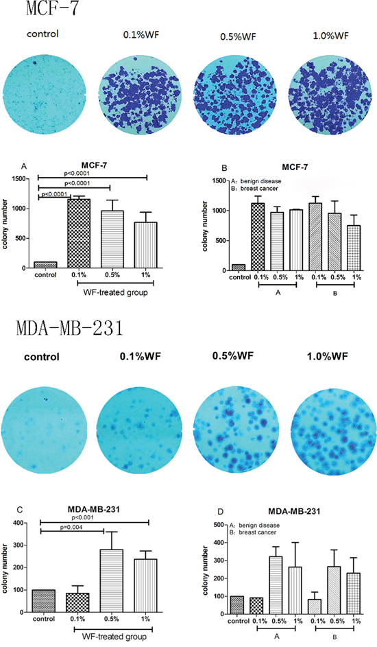 Figure 1: Colony formation assays: WF promotes MCF-7 and MDA-MB-231 cell growth. Less colonies form (both MCF-7 and MDA-MB-231 cells) in the absence of WF compared to WF-treated groups. A. 0.1%, 0.5% and 1%WF promotes colony formation of MCF-7 cells. C. The numbers of colonies form by MDA-MB-231 cells in 0.5% and 1.0% WF-treated groups are significant higher than that in 0.1%WF-treated group and the control group. B. and D. No significant difference of colony numbers are observed between benign disease and breast cancer groups (both MCF-7 and MDA-MB-231 cells).