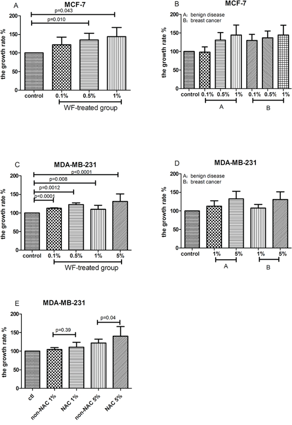 Figure 2: MTT proliferation assays: WF increases MCF-7 and MDA-MB-231 cell proliferation. A. and C. The proliferation rates of MCF-7 and MDA-MB-231 cells are significantly increased after treated with WF for 48 hours when compared to the control group. B. and D. No significant difference of proliferation rate is observed between benign disease and breast cancer groups (both MCF-7 and MDA-MB-231 cells). E. MDA-MB-231 cells treated with WF from breast cancer patients underwent neoadjuvant chemotherapy (NAC) show higher rate of proliferation.