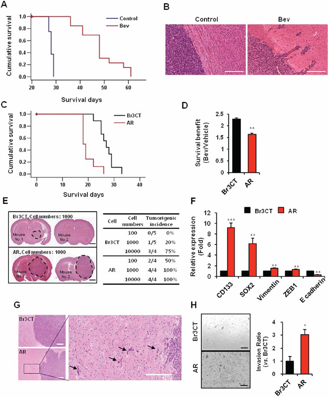Figure 1: Bevacizumab treatment increase malignant progress of GBM. A. Kaplan-Meier survival curves of mice orthotopically implanted with U87MG cells treated with or without bevacizumab. p < 0.001. B. H&E staining of brains of mice treated with or without bevacizumab. Bar represents 200 micron. C. Kaplan-Meier survival curves of mice orthotopically implanted with Br3CT or AR. p < 0.001. D. Survival benefit calculated by increasing survival rate by bevacizumab treatment in mice orthotopically implanted each cells. Data are means ± SE. **p < 0.01. E. in vivo limiting dilution tumor formation assay were performed to assess the cancer stem cell potential of AR. Br3CT or AR cells intracranially implanted and sacrificed at same time. H&E staining of mice brain which were implanted Br3CT or AR 1000 cells showed tumor formation and size. Tumorigenic incidences were calculated by rate of tumor bearing mice numbers into total mice numbers per group. Bar represents 2 millimeters. F. Expressions levels of EMT and CSC markers of GBM in Br3CT or AR cells were determined by real-time RT-PCR analysis. Data are means ± SE (n = 3). **p < 0.01 and ***p < 0.001. G. Phenotypes of tumor observed by H&E staining and margins of AR tumor were magnified (right). Arrows indicate tumor cells which were invaded into adjacent normal brain parenchymal. Bar represents 100 microns. H. Transwell invasion assays in Br3CT and AR cells were performed. Cells which were passed transwell were counted (right bar graph) after H&E staining (left). Bar represents 200 micron. Data are means ± SE. *p < 0.05.