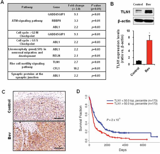 Figure 2: TLN1 expression was increased by bevacizumab treatment in GBM. A. Pathway analysis of deferent expression genes of mice orthotopically implanted U87MG treated with bevacizumab. B. Immunoblots of TLN1 in orthotopic xenograft tumor with or without betacizumab treatment (up). TLN1 expression levels were measured by density of protein bands (down). Data are means ± SE. *p < 0.05. C. IHC of TLN1 in orthotopic xenograft tumor with or without betacizumab treatment. Bar represents 200 microns. D. Rembrandt Kaplan-Meier survival curves of GBM patients with low or high expression levels of TLN1.