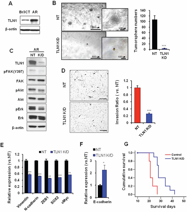 Figure 4: Effects of TLN1 inhibition on acquired malignant progression by bevacizumab treatment. A. Immunoblots of TLN1 in Br3CT or AR cells. B. Tumorsphere forming potentials of TLN1 K/D AR cells were determined by matrigel sphere forming assay. The numbers of tumorsphere were counted. Data are means ± SE. ***p < 0.001. C. Immunoblots of TLN1 and related proteins in TLN1 K/D AR. D. Transwell invasion assays in NT or TLN1 K/D AR cells were performed. Cells which were passed transwell were counted (right bar graph) after H&E staining (left). Bar represents 200 micron. Data are means ± SE. ***p < 0.001. E. Expressions levels of EMT and CSC markers of GBM in NT or TLN1 K/D AR cells were determined by real-time RT-PCR analysis. Data are means ± SE (n = 3). **p < 0.01 and ***p < 0.001. F. E-cadherin, MET marker, mRNA expression was determined by real-time RT-PCR. Data are means ± SE (n = 3). *p < 0.05. G. Kaplan-Meier survival curves of mice (n = 10 for each group) orthotopically implanted with NT or TLN1 K/D AR. p < 0.001.
