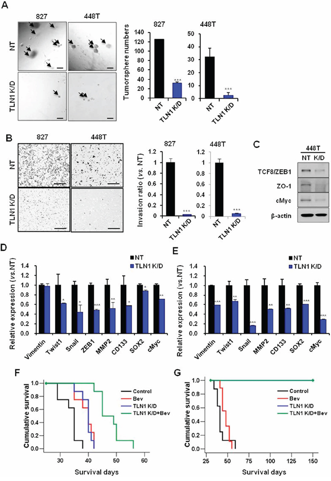 Figure 5: Effects of TLN1 inhibition on malignant progression and survival gains by bevacizumab in patient derived GBM cells. A. Tumorsphere forming potentials of TLN1 K/D patient GBM cells were determined by matrigel sphere forming assay (Left). Bar represents 100 microns. The numbers of tumorsphere were counted (Right). Data are means ± SE. ***p < 0.001. B. Transwell invasion assays in NT or TLN1 K/D patient derived GBM cells were performed. Cells which were passed transwell were counted (Right) after H&E staining (Left). Bar represents 200 micron. Data are means ± SE. ***p < 0.001. C. Immumoblots of EMT and CSC proteins in TLN1 K/D patient derived GBM cells. D. and E. Expressions levels of EMT and CSC markers of GBM in NT or TLN1 K/D in patient derived GBM cells [827 (D) and 448T (E)] were determined by real-time RT-PCR analysis. Data are means ± SE (n = 3). *p < 0.05, **p < 0.01 and ***p < 0.001. F. and G. Kaplan-Meier survival curves of mice (n = 10 for each group) orthotopically implanted with NT or TLN1 K/D patient derived GBM [827 (F) and 448T (G)] and each groups were divided into two groups with bevacizumab treatment or not.