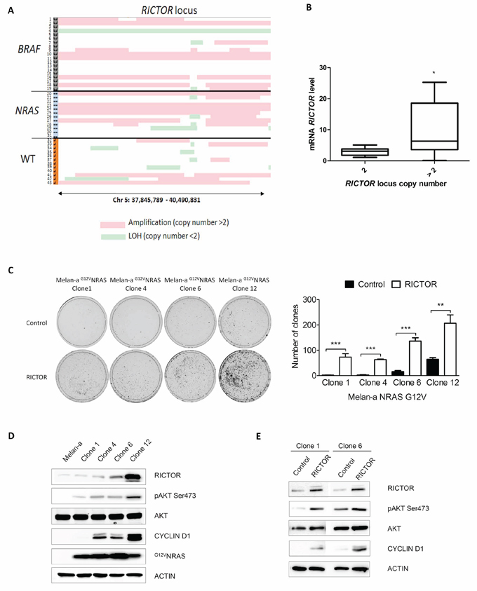 Figure 3: RICTOR locus is amplified in melanoma and stimulates clonogenicity and cyclinD1 expression in G12VNRAS transformed Melan-a. A. Melanoma cell lines derived from patients were analyzed by CGH array at RICTOR and PTEN loci. Numbers 1 to 43 indicate cell line number. Red lines correspond to amplification (copy number > 2) and green lines to loss of heterozygosity (copy number < 2). B. RICTOR mRNA level was quantified by quantitative RT-PCR in 22 short term melanoma cell lines with (> 2) or without (2) RICTOR locus amplification. C. Transformed G12VNRAS Melan-a were transfected with empty vector or with vector containing human RICTOR cDNA. Cells were selected by blasticidin and colonies were counted after 10 days (data are represented as mean +/− SD). D. Levels of phosphorylated proteins and total proteins were analyzed by Western Blotting in 4 different clones of transformed G12VNRAS Melan-a (clone 1, 4, 6 and 12). E. Transformed G12VNRAS Melan-a clones 1 and 6 were transfected with empty vector or with vector containing human RICTOR cDNA and levels of phosphorylated proteins and total proteins were analyzed by Western Blotting.