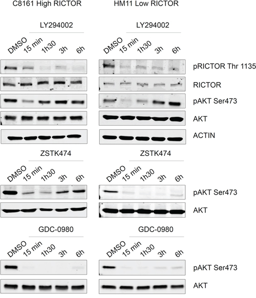 Figure 4: Reactivation of AKT is increased in G12VNRAS mutated melanoma cell line expressing high level of RICTOR compared low level of RICTOR. Human Q61KNRAS mutated melanoma cell lines, C8161, expressing a high level of RICTOR, and HM11, expressing a low level of RICTOR were treated for 15 minutes, 1 h30, 3 hours or 6 hours with DMSO (control), LY294002 (5 μM), ZSTK474 (0.2 μM) or GDC-0980 at (0.5 μM). Level of phosphorylated protein or total protein are analyzed by Western Blotting.