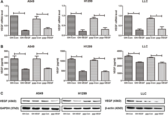 Figure 1: ppp-VEGF efficiently silences VEGF expression in NSCLC cells. Various lung cancer cell lines A549, H1299 and LLC were treated with nonspecific siRNA (OH-Con, ppp-Con), or siRNA targeting VEGF (OH-VEGF, ppp-VEGF) for 48 hours. A. Total mRNA was then isolated and VEGF mRNA expression was analyzed by qRT-PCR. Or B. supernatants were harvested and VEGF secretion was determined by ELISA. Or C. cell lysates were harvested and VEGF protein level was determined by western blot. Similar results were obtained in two independent experiments.*p < 0.05.