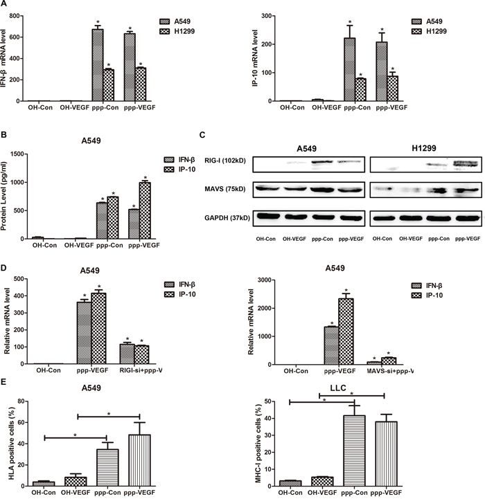 Figure 3: ppp-VEGF activates RIG-I signaling and induces type I IFN responses in vitro. A549 and H1299 were treated with OH-control, OH-VEGF, ppp-control or ppp-VEGF for 48 h, then A. total mRNAs were harvested, IFN-β mRNA expression and downstream IP-10 mRNA expression were quantified by qRT-PCR, or B. the supernatant of A549 cells was collected and production of IFN-β and IP-10 was quantified by Elisa, or C. cell lysates of A549 and H1299 cells were harvested, the expression of RIG-I and MAVS was assessed by western blot. D. A549 cells were transfected with nonspecific control siRNA or specific siRNA targeting RIG-I for 24 hours, and then cells were treated with OH-Control or ppp-VEGF. The expression of IFN-β and IP-10 was detected by qRT-PCR. E. A549 and LLC cells were treated with OH-control, OH-VEGF, ppp-control or ppp-VEGF for 48 h, the expression of HLA or MHC-I was determined by flow cytometry. Similar results were obtained in 2 independent experiments. *p < 0.05.