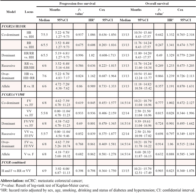 The influence of the two SNPs on the clinical efficacy and survival were described in Table 2 and 3. H131R within FCGR2A weren’t associated with ORR (P = 0.542 for HR vs. HH; P = 0.357 for RR vs. HH; P = 0.454 for HR/RR vs. HH; P = 0.598 for RR vs. HH/HR; P = 0.710 for HR vs. HH/RR; P = 0.409 for R vs. H) and DCR (P = 0.644 for HR vs. HH; P = 0.461 for RR vs. HH; P = 0.559 for HR/RR vs. HH; P = 0.527 for RR vs. HH/HR; P = 0.787 for HR vs. HH/RR; P = 0.510 for R vs. H) in co-dominant, dominant, recessive, over-dominant and allele genetic models, respectively. No statistical significant difference in response to cetuximab based therapy (P = 0.425 for FV vs. FF; P = 0.835 for VV vs. FF; P = 0.454 for FV/VV vs. FF; P = 0.967 for VV vs. FF/FV; P = 0.441 for FV vs. FF/VV; P = 0.535 for V vs. F) or DCR (P = 0.463 for FV vs. FF; P = 0.957 for VV vs. FF; P = 0.559 for FV/VV vs. FF; P = 1.000 for VV vs. FF/FV; P = 0.446 for FV vs. FF/VV; P = 0.718 for V vs. F) based on FCGR3A V158F was observed. Also, there was no significant association between FCGR combined genotype and ORR (P = 0.642 for RR or VV vs. H and F) and DCR (P = 0.554 for RR or VV vs. H and F) in present study.
