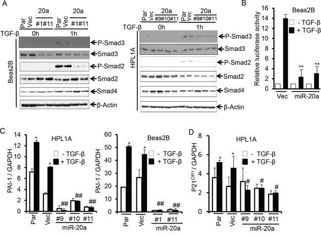 Figure 3: MiR-20a attenuates TGF-β/Smad signaling. A. Beas2B and HPL1A cell clones with miR-20a stable expression and their parental and control vector cells were serum starved for 2 h and then treated with 5 ng/ml TGF-β for 1 h. Indicated proteins were analyzed by western blotting. B. Beas2B cells with miR-20a stable expression and control vector cells were transfected with TGF-β responsive luciferase vector (CAGA)9 MLP-Luc. Transfeted cells were treated with 5 ng/ml TGF-β for 22 h. Luciferase and ß-galactosidase activities were measured. **P < 0.01, vs. TGF-β treated vector cells (Vec). C. and D. QRT-PCR analysis was performed with total RNA from cells in “Figure 3A” treated with 5 ng/ml TGF-β for 5 h. *P < 0.05, vs. TGF-β untreated cells in each group, #P < 0.05, ##P < 0.01, vs. TGF-β treated cells in parental and vector groups.