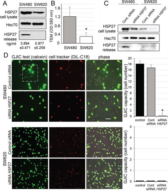 Figure 1: HSP27 knockdown inhibits the gap junctional coupling between SW480 cells and HMEC. A. Expression of HSP27 in the two CRC cell lines, SW480 and SW620 cells. Detectable amounts of HSP27 in supernatants of SW480 cells but not of SW620 cells (media collected after 12 h). Immunoblots representative of 5 experiments (Hsc70 as loading control). Values indicate amounts of HSP27 measured by ELISA in supernatant of SW480 and SW620 cells for 12 h (mean ± SD; n = 4; P-values < 0.01). B. Transendothelial migration (TEM) of CRC cell lines. Control HMEC monolayers grown on Transwells were kept in FCS-free conditions overnight. Untreated SW480 and SW620 cells (3 × 105) were added into the wells. After coculturing for 6 h, invasive cells on the membrane bottom were stained and quantified at OD 560 nm after extraction (mean ± SD; *P-values < 0.01; n = 5). C. siRNA transfection decreases the HSP27 expression in CRC cells and suppressed its release by SW480 cells. Representative immune-blot of HSP27 protein level in both SW480 and SW620 cells transfected with control siRNA or siRNA HSP27 for 2 days (n = 5; Hsc70 as loading control). D. Functional GJIC between SW480 cells and HMEC. The both CRC cell lines, SW480 and SW620 cells (donors), were preloaded with calcein/AM and DiL-C18. Calcein diffuses through gap junctions, while DiL-C18 does not. Labelled CRC cells are then plated with unlabeled HMEC monolayer (receivers). HMEC establishing GJIC with CRC cells become fluorescent by calcein diffusion. Only SW480 cells establish GJIC with HMEC and siRNA HSP27-transfected cells improved it (upper panels). No calcein diffusion was observed from SW620 cells in spite of their adhesion to HMEC (lower panels). Phase-contrast microphotographs after 6 h of culture (representative of 6 experiments; Bar 100 μm). Right, histogram represents the total cell number of HMEC receiving dye (calcein) per CRC cell (mean ±SD, n = 3; *P-values < 0.01 vs control).