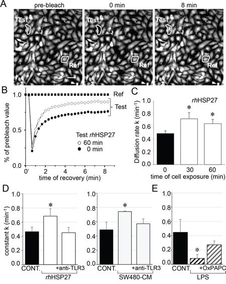 Figure 2: Extracellular HSP27 increases the endothelial gap-junction coupling. A. FRAP analysis of cell-to-cell communication. Digital images of fluorescence distribution in a HMEC monolayer at three times during a typical gap-FRAP experiment: prebleach, just after bleaching (0 min) and after fluorescence recovery (8 min). Bars 20 μm. Corresponding fluorescence intensities (% of prebleach value) versus time in tested cells. The fluorescence in one unbleached cell (Ref) was used to correct the artefact loss of fluorescence. Note the fluorescence recovery follows an exponential time course when the bleached cells (circles) are interconnected by open gap-junction channels to unbleached cells (black squares are Ref). The relative permeability of gaps is given by the time constant k. B. Recombinant human HSP27 (rhHSP27) effect on GJIC. Graph represents mean ± SEM of the fluorescence redistribution after photobleaching in coupled HMEC in control (●) or after 60 min (○) with rhHSP27 (5 μg/ml). C. Histogram shows k values measured after the rhHSP27 addition for 0, 30 and 60 min (mean ± SD, n = 8; *P < 0.05 vs control [t = 0 min]). D. Both rhHSP27 and SW480-conditioned media (-CM; collected after 6 h) increase the GJIC in a TLR3-dependent manner. Cells exposure for 30 min, in the absence or the presence of neutralizing anti-TLR3 antibody (20 μg/ml) (mean ± SD, n = 4; *P < 0.01 vs control). E. LPS (1 μM) blocks GJIC within 60 min. This inhibitory effect was prevented by OxPAPC (30 μg/ml), a TLR4/TLR2 inhibitor (mean ± SD, n = 4; *P < 0.01 vs control).