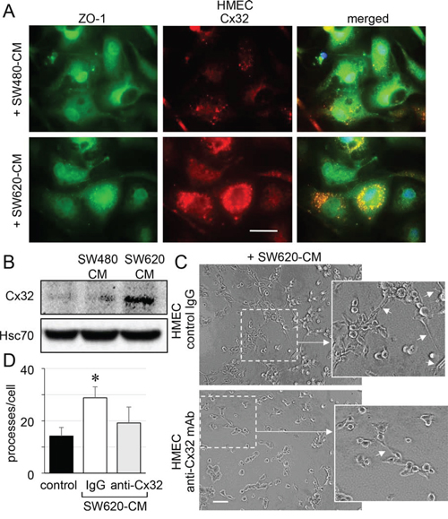 Immunofluorescence analyses revealed that unstimulated HMEC expressed very low levels of Cx32 (not shown) and that the protein was only weakly expressed at the apical membrane of some cells after 6 h of exposure to SW480-CM (Fig. 4A). In contrast, we detected a strong apical membrane and cytoplasmic expression of Cx32 in HMEC exposed to SW620-CM for 6 hours (Fig. 4A). Immunoblot analysis of cell lysates identified a drastic increase in Cx32 expression in HMEC exposed to SW620-CM (Fig. 4B). Using an in vitro matrigel tube formation assay [19], we observed also that SW620-CM could promote the ability of endothelial cells to form capillary-like structures (i.e., increased branches per cell; Fig. 4C, 4D). To explore the contribution of Cx32 to this effect, we performed loss-of-function experiments through intracellular transfer of a Cx32 blocking monoclonal antibody [27]. Cx32 blockade dramatically reduced the ability of HMEC incubated with SW620-CM to form capillary-like structures (Fig. 4C, 4D).