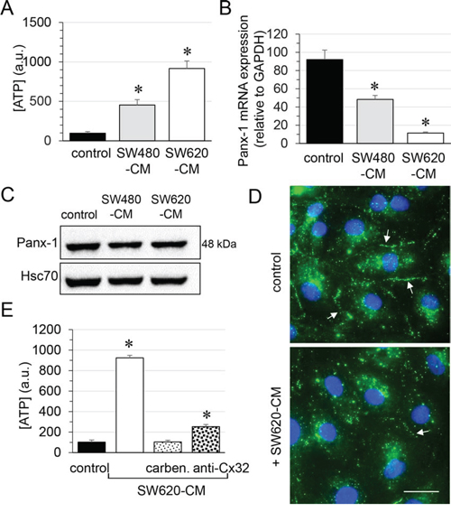 Figure 5: Role of endothelial Cx32 in SW620-CM-triggered ATP release in HMEC. A. Both SW480 and SW620 cell-conditioned media triggered ATP accumulation in HMEC bath medium within 6 h. Extracellular ATP was measured by Luciferase assay (means ± S.D. n = 4; *P-values < 0.01 vs control). B. Panx-1 mRNA expression in HMEC after 6 h of control or CRC cell-CM exposures. A drastic decrease in Panx-1 expression was observed with SW620-CM (means ± S.D. n = 3; *P-values < 0.05 vs control). C. Panx-1 protein expression in HMEC was unchanged by exposure to SW480- and SW-620-CM for 6 h (mean ±SD, P-values = 0.4980 Mann-Whitney U test; n = 4). D. Cell surface localization of Panx-1 was decreased in HMEC exposed to SW620-CM for 6 h. Arrows indicated Panx-1 plaques at the plasma membrane. DAPI staining of nuclei. Optical section of 0.5 μm thickness (n = 5, Bar 12 μm). E. SW620-CM-triggered ATP release is inhibited by gap junction blocker, carbenoxolone (carben., 100 μM, 30 min) and by neutralizing Cx32 antibody (0.2 μg anti-Cx32 mAb) in HMEC (means ± S.D. *P-values < 0.01 vs control; n = 3).