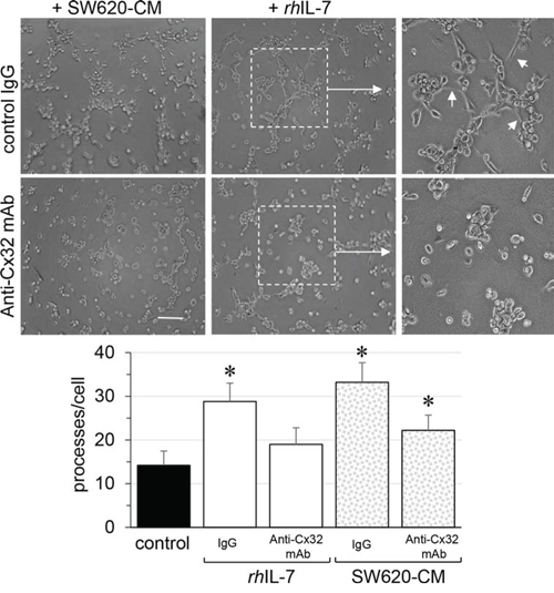 Figure 7: Endothelial Cx32 contributes to angiogenic effects of IL-7 as SW620-CM does. In vitro tubulogenesis assay of HMEC pretreated or not (control IgG) with inhibitory monoclonal antibody against Cx32 (0.2 μg/ml anti-Cx32mAb). HMEC were plated on Matrigel-coated 24-well plates, incubated with SW620-CM or human recombinant rhIL-7 (1 ng/ml) for 6 h, and photographed (Bar 80 μm). The dotted areas are enlarged in the inserts on the right. Arrows indicated branch points. Histogram shows the number of branch points per field of view (at least 80 single cells were scored; mean ± SD, n = 4; *P < 0.01 vs control). Blocking Cx32 decreases rhIL-7- and SW620-CM-induced tube formation (*P < 0.05 vs control; n = 3).