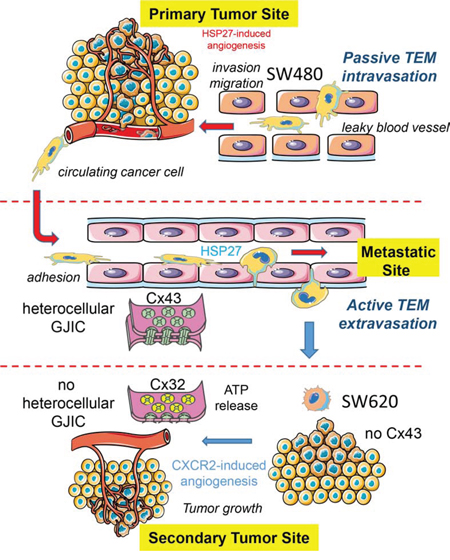 The gradual loss of functional Cx43 gap junction and the increased expression of Cx32 in colorectal cancer biopsy were previously associated with a worst tumor grading, suggesting a role for these connexins in metastasis formation [11-13]. Here, we demonstrate that tumor cells can affect the expression of Cx proteins in endothelial cells. Cells derived from a primary tumor secrete high levels of HSP27 that promotes the phosphorylation of Cx43 in endothelial cells and the formation of gap junction between tumor and endothelial cells. Cells derived from a metastatic site in the same patient do not modulate Cx43 in endothelial cells but rather promote Cx32 expression and tube formation through a mechanism that involves CXCR2 expression. A model is proposed in Fig. 8.