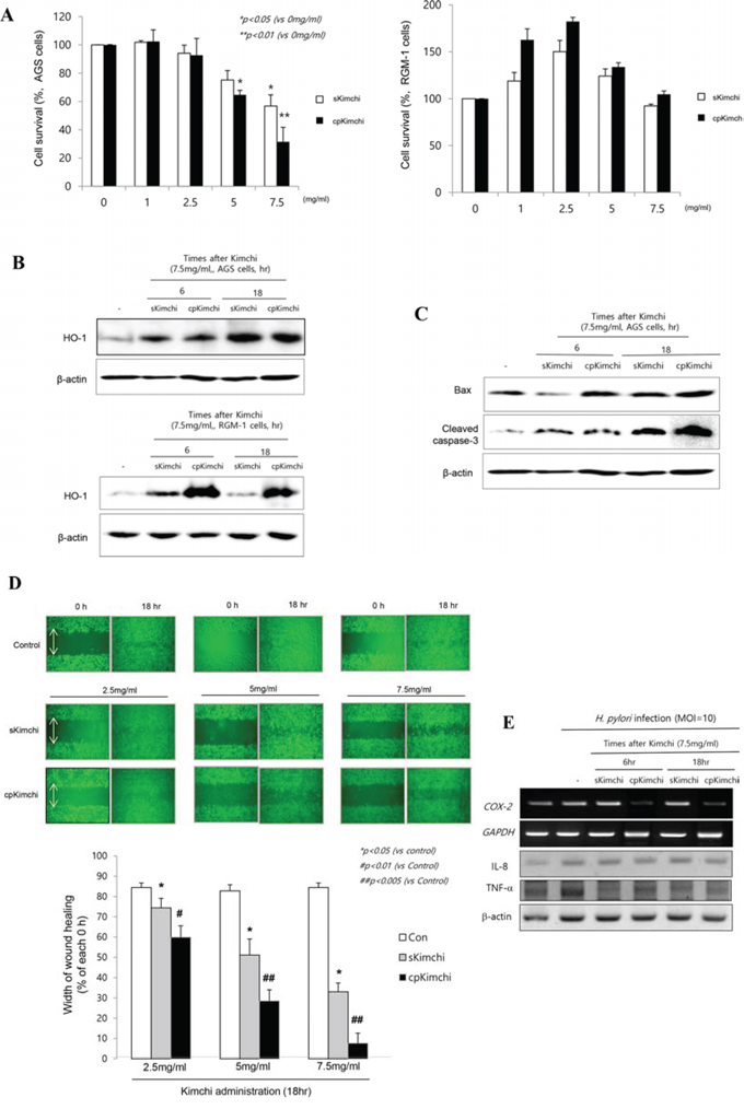 Figure 1: Biological actions of standard Kimchi (sKimchi) and cpKimchi; comparison in in vitro H. pylori cell model. A. Cell survival by MTT assay MTT assay was done in AGS cells (left) and RGM-1 cells (right) under the challenge with 1, 2.5, 5, and 7.5 mg/ml concentration of sKimchi and cpKimchi soluble extracts, respectively. Significant cytotoxicities were noted with kimchi more than 5 mg/ml concentration only in AGS cells, none in RGM-1 cells even after kimchi more than 5 mg/ml B. Western blot of HO-1 after each kimchi extracts C. Western blot for Bax and cleaved caspase-3 D. Wound healing assay in AGS cells Previous study showed cpKimchi afforded selective cytotoxicity in cancer cells, wound healing assay after each kimchi extracts administration was done in AGS cells. Significantly delay in wound healing was noted in group administered with cpKimchi extracts. E. RT-PCR and Western blot for COX-2, IL-8, and TNF-α in the presence of H. pylori infection (MOI = 10). cpKimchi significantly attenuated H. pylori-induced COX-2 and TNF-α expression.