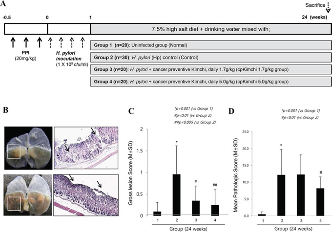 As a dietary intervention for H. pylori infection, we invented novel cancer preventive kimchi (cpKimchi) recipe and put hypothesis that dietary intervention of our cpKimchi can prevent H. pylori-associated gastric cancer in mice model. Generation of cpKimchi was based on the addition of mustard leaf, pear, mushroom, Chinese pepper, and sea tangle juice onto standardized kimchi recipe (see Supplementary table 1), which was chosen by our preliminary study.