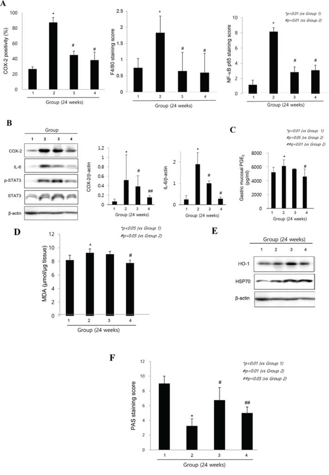 Figure 3: Molecular mechanisms explaining anti-inflammatory and rejuvenating action of cpKimchi (24 weeks after H. pylori infection). A. The changes of immunohistochemical stainings of COX-2, F4/80, and NF-κB p65 expression according to group The increased expressions of COX-2 were one of core pathogenic mechanisms after H. pylori infection. The expressions of COX-2 were significantly increased in control group (p < 0.01). Macrophage and monocytes were intensively increased with H. pylori infection. However, macrophage infiltrations were significantly decreased in group treated with cpKimchi (p < 0.01). When performed immunostaining with NF-κB p65, significantly increased expressions were noted in control group, whereas much attenuated expressions were seen in group treated with cpKimchi (p < 0.01). B. Changes of western blot of COX-2, IL-6 and STAT3 activation according to group On western blot analysis of mucosal COX-2 expression, COX-2 was significantly increased after H. pylori infection (p < 0.01), but its expressions were significantly decreased in group treated with cpKimchi (p < 0.05). In searching for other intervening factors, significantly increased IL-6 and STAT3 activation was seen in control group. cpKimchi significantly attenuated these levels of IL-6 and associated STAT3 activation (p < 0.05). C. PGE2 changes according to group Measuring PGE2 levels were done with ELISA and mucosal PGE2 levels were significantly decreased in group treated with cpKimchi 5 mg/kg (p < 0.01). D. MDA levels according to group Oxidative stress relevant to NF-κB activation was reflected with the levels of MDA, index of lipid peroxidation. H. pylori infection significantly increased the levels of MDA, but these levels were significantly decreased with cpKimchi administration (p < 0.05). E. Changes of HO-1 and HSP70 according to group As indirect index of oxidative stress, we have measured the expressions of HO-1 and HSP70, respectively and the expressions of HO-1 and HSP70 were significantly increased in group treated with cpKimchi (p < 0.05). F. Gastric mucins according to group The gastric mucin was significantly decreased after H. pylori infection (p < 0.01), but its levels were significantly maintained with cpKimchi administration.