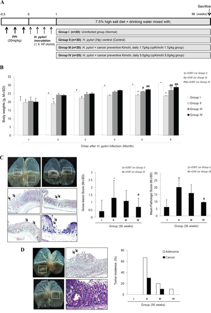 Figure 4: Prevention of H. pylori-induced gastric tumorigenesis with long-term intake of cpKimchi (36 weeks after H. pylori infection). A. Protocol for H. pylori-associated gastritis model, 36 weeks. In order to document the influence of cpKimchi onto the changes of tumorigenesis, the animal model was further extendedly observed up to 36 weeks B. Changes of body weights according to group Though the weight losses were significantly noted after H. pylori infection at 2 months post-infection (p < 0.05), significant weight changes were noted after 5–6 months, statistically significantly blocking of weight loss in group administered with 5 mg/kg cpKimchi (p < 0.05). C. Gross and pathological pictures and index according to group On gross evaluation of resected stomach, the following findings were obtained; nodular mucosal changes, thinned gastric mucosa, adenomatous polyps, and tumorous lesion with central ulcerations. The criteria for gross lesion score was shown in “Materials and Methods”. The whole gross lesion index was significantly increased in control group, but significantly decreased in group administered with cpKimchi (p < 0.05). Severe chronic atrophic gastritis, gastric ulcer, gastritis cystica profunda, adenoma, and adenocarcinoma were shown in control group. X 100. The mean pathological scores were significantly increased in control group, but significantly decreased in group administered with cpKimchi (p < 0.05). The scoring system was described in Supplementary table 2. D. The gastric cancer occurrence rate according to group Gastric adenoma and cancer occurrence were significantly increased in control group, but significantly decreased in group administered with cpKimchi.