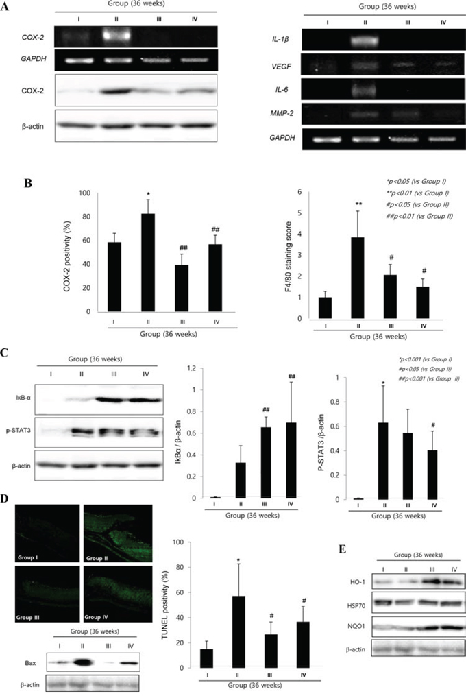 Similar to the molecular changes observed at 24 weeks, COX-2 and F/80 expressions were significantly increased in H. pylori infected control group (Fig. 5A & 5B). Focused onto COX-2, as seen in Fig. 5A, COX-2 mRNA as well as COX-2 expressions were significantly increased in Group II, but their levels were significantly decreased in Group III and Group IV (p < 0.01). Fig. 5B showed the mean changes of macrophage infiltrations according to group. Group II showed significantly increased infiltrations of macrophages (p < 0.01), but cpKimchi administration showed significantly decreased macrophage infiltrations (p < 0.05). On western blot and RT-PCR analysis of mucosal COX-2 expression, COX-2 was significantly increased after H. pylori infection, but its expressions were significantly decreased in group treated with cpKimchi (Fig. 5A). As a result, macrophage-related inflammatory mediators, including IL-1β, VEGF, IL-6, and MMP-2, all known to be engaged in either H. pylori-associated gastritis or carcinogenesis, were significantly increased in Group II. However, as noted in Fig. 5B, all of these macrophages-associated inflammatory mediators were significantly decreased in group II and IV, fortifying the suppressive actions of cpKimchi against H. pylori-associated macrophage infiltrations and activations. Especially, transcription factors engaged in these gastric inflammations, STAT3 and NF-κB, H. pylori infection significantly activated STAT3 and NF-κB activations (Fig. 5C). cpKimchi administration significantly inactivated NF-κB as reflected with increased levels of IκB-α (data not shown, but NF-κB p65 immunohistochemical stainings were significantly decreased in Group II and IV whereas significantly increased in Group II) as well as STAT3 phosphorylation. Since rejuvenating actions were imposed with cpKimchi that chronic atrophic gastritis was significantly decreased in Group 3 and 4 of 24 weeks observation (Fig. 2B), we have checked apoptosis and cytoprotective protein expressions according to group. Upon TUNEL staining to count apoptotic index, H. pylori infection was associated with significant bouts of apoptosis, but cpKimchi significantly attenuated apoptosis (Fig. 5D). Additional finding of Bax expression consistently showed increased expression at Group II. NQO1 and HO-1 are associated with antioxidative and cytoprotective function. Their expressions of NQO1 and HO-1 were significantly increased in Group III and IV (Fig. 5E).