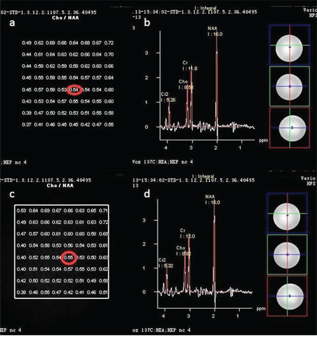 Figure 1: In phantom study totally 64 points to points Cho/NAA ratio in 0 min’s scan a. did not differ from 6 min’s 1c. The Cho/NAA ratio in one point in 0 min’s scan 0.54, b. did not differ from the relevant point in 6 min’s scan (0.55, 1 d.)