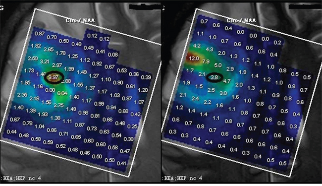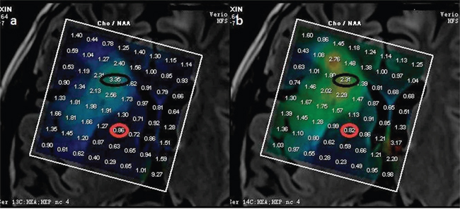 Figure 2: Cho/NAA of a low grade glioma (WHO II). The max Cho/NAA ratio in tumoral area in 0’min scan (a. 3.35) was different from the relevant value in 6 min’s scan (b. 2.31), while the max Cho/NAA ratio in surrounding normal tissue area in 0′min scan (a, 0.86) did not differ from the relevant value in 6 min’ s scan (b, 0.82).