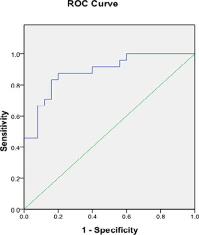 Figure 7: Receiver operating characteristic curve analysis for ΔCho/NAA of high-grade and low-grade glioma. Area under curve shows good accuracy (0.885) for discriminating high-grade from low-grade glioma using ΔCho/NAA measurement on dynamic 1H-MRS maps.