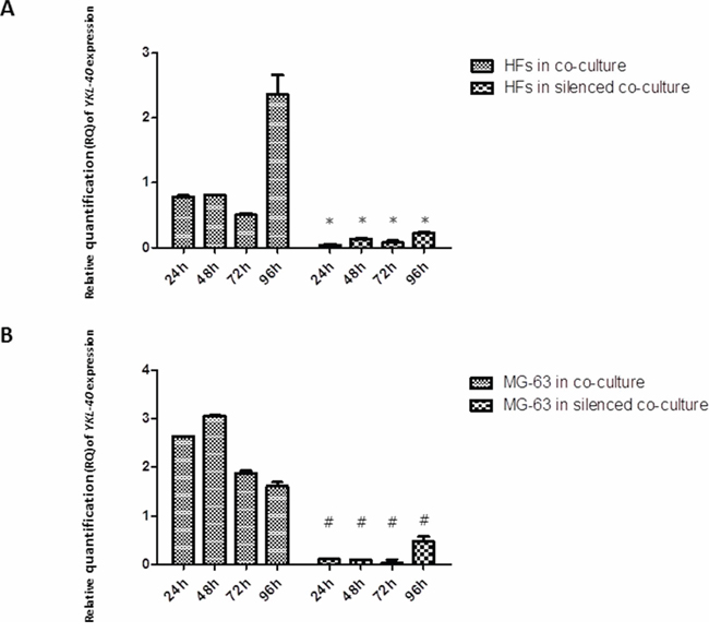 Figure 3: A. and B. Real-Time PCR for YKL-40. In MG-63 cells, siRNA knockdown of YKL-40 reached the maximum efficiency at 72 h, with respect to the expression of YKL-40 in normally co-cultured MG-63 cells, in which the levels of YKL-40 are significantly higher. In normal co-culture, fibroblasts had increased levels of YKL-40, reaching the highest peak at 96 h. In fibroblasts co-cultured with the silenced MG-63 cells, YKL-40 was at the minimum level. *represents a significant difference from HF cells grown in normal co-culture, P < 0.05. #represents a significant difference from MG-63 cells grown in normal co-culture, P < 0.05.