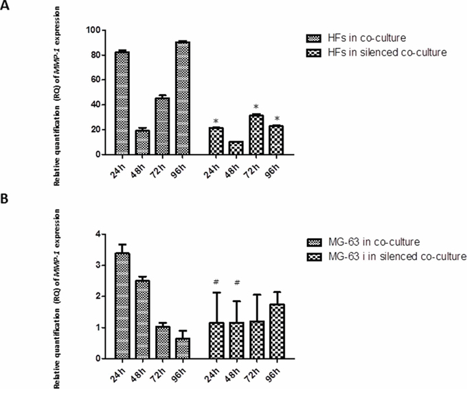 Figure 5: A. and B. Real-Time PCR for MMP-1. The expression of MMP-1 was weak in MG-63 cells grown in both co-cultures. In normal co-culture, MMP-1 was strongly expressed in HFs and increased to a maximum peak at 96 h. In the silenced co-culture, its expression was three-fold lower than in the normal co-culture. *represents a significant difference from HF cells grown in normal co-culture, P < 0.05. #represents a significant difference from MG-63 cells grown in normal co-culture, P < 0.05.