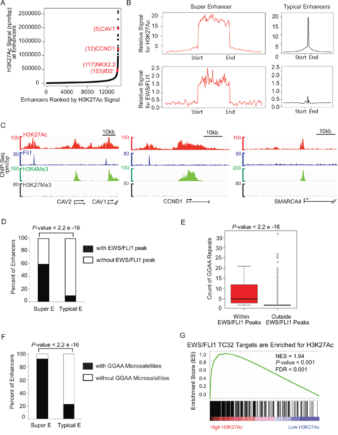 Figure 1: Super-enhancer profiling in TC32 identifies CCND1 and other important EWS/FLI1 targets. A. Total H3K27Ac ChIP-seq signal in units of reads per million in enhancer regions for all enhancers in TC32. Enhancers are ranked by increasing H3K27Ac ChIP-seq signal. B. Metagene representation of global H3K27Ac or EWS/FLI1 occupancy at typical enhancers and super-enhancers in TC32. Metagenes are centered on the enhancer region, and the length of the enhancer reflects the difference in median length (2 kb for typical enhancers, 33 kb for super-enhancers). Additional 5 kb surrounding each enhancer is also shown. The y axis shows the relative ChIP-seq signal. C. Gene track of H3K27Ac (red), and FLI1 (blue), H3K4Me3 (green), H3K27Me3 (grey). ChIP-seq occupancy at the super-enhancer regions surrounding CAV1/2 and CCND1, and at the typical enhancer region upstream of SMARCA4. D. Fisher test showed super-enhancer regions have significantly more EWS/FLI1 peaks than typical enhancer regions (odd ratio = 15.8, P-value < 2.2 x e-16.) E. Two tailed t-test showed that the GGAA microsatellites in EWS/FLI1 peaks have more GGAA repeat counts than those in other genome regions outside of the EWS/FLI1 peaks (average GGAA count in EWS/FLI1 peaks = 7.3, average GGAA count outside EWS/FLI1 peaks = 2.3, P-value < 2.2 e-16.) F. Fisher test showed super-enhancer regions have significantly more GGAA microsatellites than typical enhancer regions (odd ratio = 38.0, P-value < 2.2e-16.) G. GSEA demonstrates enrichment of H3K27Ac binding in EWS/FLI1 target genes.