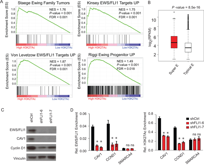 Figure 2: Super-enhancers play important role in Ewing sarcoma biology. A. GSEA demonstrates that the Ewing family tumor gene signature and the various EWS/FLI1 target signatures are all enriched in genes with extremely high binding of H3K27Ac in the enhancer region. B. Box plots of expression values in TC32 cells for genes with proximal typical enhancers (white) or with proximal super-enhancers (red). C. mir30-shRNA-mediated knockdown of EWS/FLI1 in the TC32 cell line reduced the protein levels of the Ewing super-enhancer-associated genes CAV1 and CCND1, with vinculin as a control. D. ChIP-qPCR analysis showing that conditional EWS/FLI1 knockdown in TC32 cells reduced the relative enrichment of EWS/FLI1 and H3K27Ac in the super-enhancer regions (CAV1, CCND1) but not in the typical enhancer region (SMARCA4). *P-value < 0.01, ns: not significant.