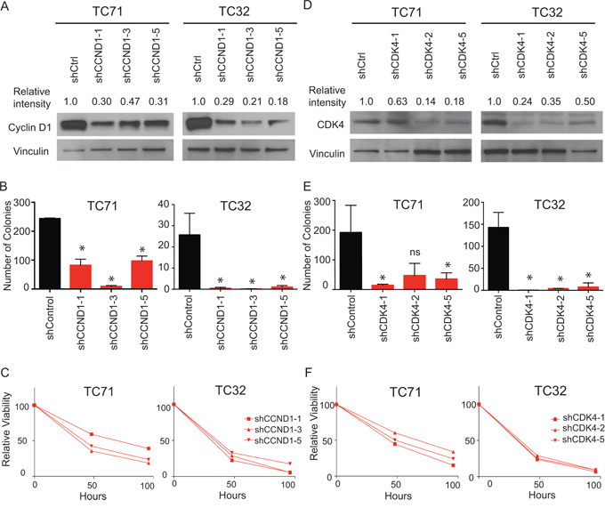 Figure 5: Targeting CDK4 and cyclin D1 with shRNA mediated knockdown results in impairment in both cell growth and colony formation. A. Western blot showing decreased levels of cyclin D1 after transduction with shRNAs targeting cyclin D1 or a control. Relative intensity was quantified with NIH ImageJ. B. Decreased colony formation of cyclin D1 shRNA transduced cells versus control. Error bars represent +/− SEM of two independent experiments. *P-value < 0.05, ns: not significant. C. Relative viability over time of TC71 and TC32 cells transduced with indicated cyclin D1 targeting hairpins compared to cells transduced with control hairpin. Results were plotted as percentage of viability in cyclin D1 shRNA transduced cells compared to control shRNA transduced cells, based on the luminescent value at each timepoint. Shown is a representative of three independent experiments. D. Western blot showing decreased levels of CDK4 after transduction with shRNAs targeting CDK4 or control. Relative intensity was quantified with NIH ImageJ. E. Decreased colony formation of CDK4 shRNA transduced cells versus a control. Error bars represent +/− SEM of three independent experiments. *P-value < 0.05, ns: not significant. F. Relative viability over time of TC71 and TC32 cells transduced with indicated CDK4-targeting hairpins compared to cells transduced with a control hairpin. Results were plotted as the percentage of viability in cyclin D1 shRNA transduced cells compared to control shRNA transduced cells, based on the luminescent value at each timepoint. Shown is a representative of three independent experiments.
