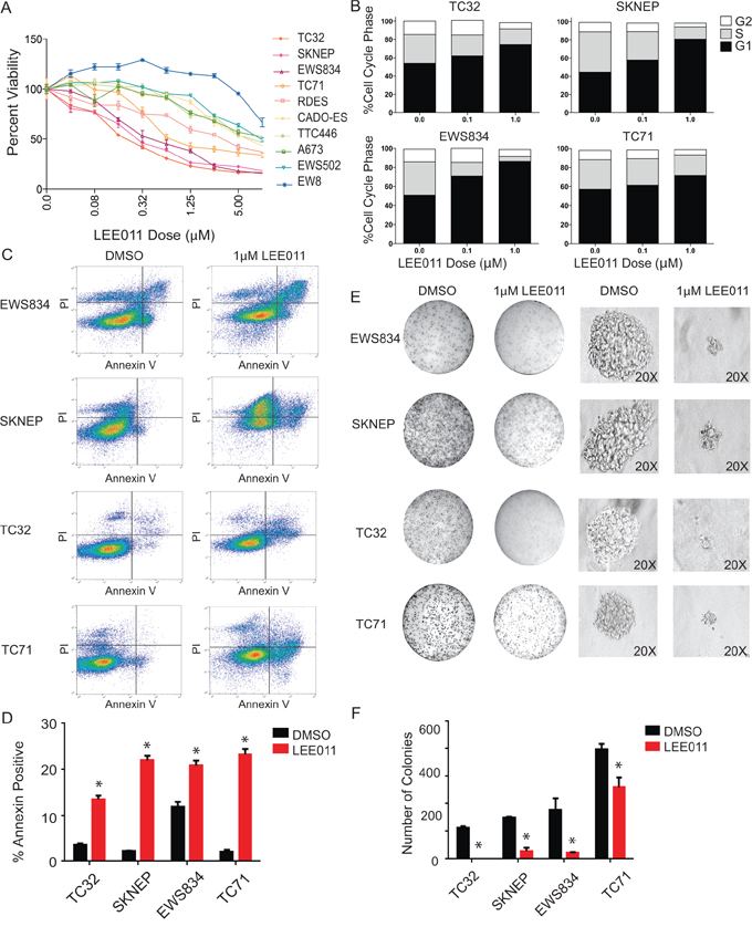 To complement these shRNA studies, we tested the effects of a selective small-molecule inhibitor of CDK4/6, LEE011, in Ewing sarcoma cells. A panel of Ewing sarcoma cell lines was cultured with serially diluted concentrations of LEE011 and cell viability measured following five days of treatment. Target inhibition was confirmed by western blotting for phosphorylated RB at serine 780 (Supplementary Figure S3B) and the range of IC50s was 0.26 –11.8 μM (Figure 6A and Supplementary Table S5). Sensitivity to LEE011 was correlated with sensitivity to PD0332991 (Supplementary Figure S4A) and was not based on intrinsic cell growth properties of the various Ewing lines tested (Supplementary Figure S4B). Because CDK4/6 inhibitors primarily induce a G1 cell cycle arrest in cancer cells with a functional Rb protein, we examined the effect of CDK4/6 inhibition on cell cycle in Ewing sarcoma cells. We observed a concentration-dependent G1 arrest in the majority of Ewing sarcoma cell lines tested (Figure 6B). We also noted decreased growth over time in many of the cell lines tested (Supplementary Figure S4C). In addition, cell death was observed as determined by trypan blue exclusion (Supplementary Figure S4D). In support of this observation, there was a marked increase in annexin V positivity by flow cytometry in some of the cell lines tested (Figure 6C–6D). In addition, when treated with 1 μM LEE011, Ewing sarcoma cell lines had decreased growth in methylcellulose, as demonstrated by smaller and fewer colonies formed in the presence of LEE011 compared to DMSO (Figure 6E–6F). These studies establish LEE011 as a potent inducer of cell cycle arrest and cell death in a subset of Ewing sarcoma cell lines.